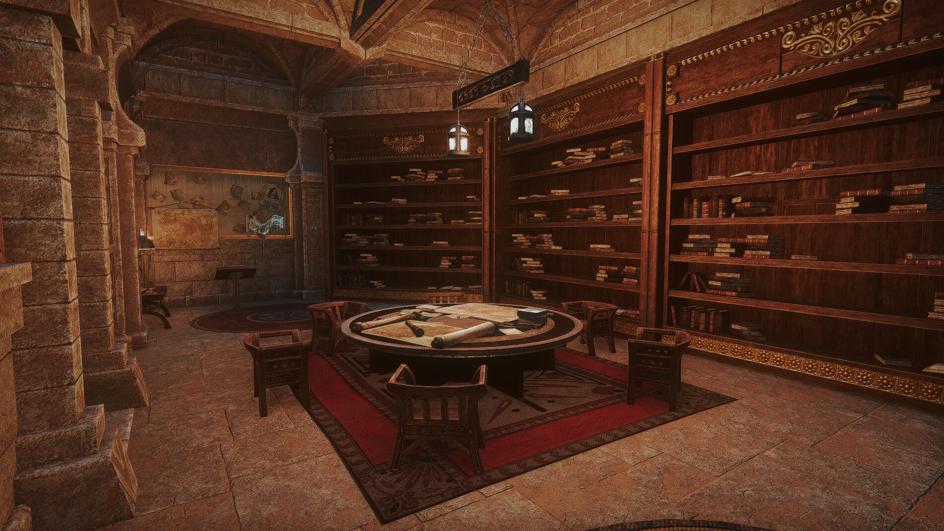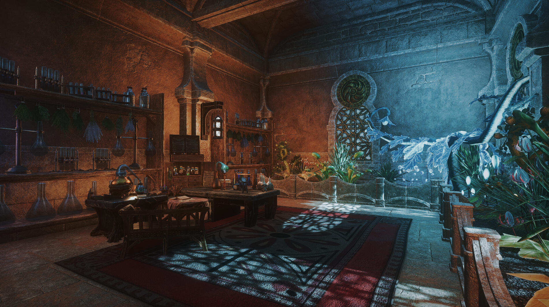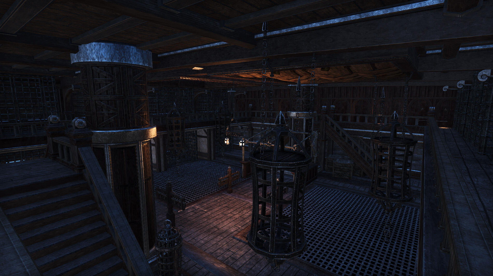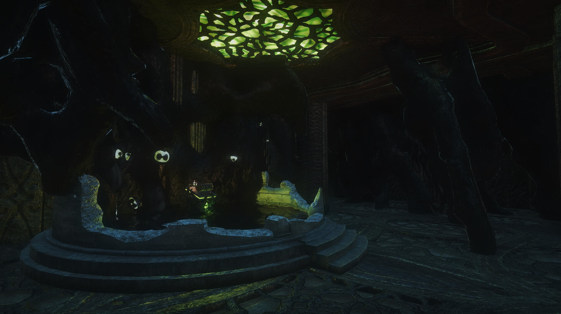 Nestled comfortably along the edges of Fargrave's City District, overlooking those gargantuan skeletons of the Bearers, is the Inquisitorum - home to the Eclipse. The location once bore another name and was used at the whims of a House Hexos exile, Cnisia Hexos, who split from the family during their earliest days in Fargrave for attempting to make his own version of Redmaiden.It is said that he made a pact with Hermaeus Mora to use pools of Apocryphal Ink and sacred water to travel between the realms to distribute his psuedo-Redmaiden without the intereference of the Tong - the Grasp, finding this unacceptable, requisitioned the building to House Hexos where it lay dormant for centuries. Evidence of Cnisia's plot still rests in the basement of the Inquisitorum now, with his poorly constructed portals constantly bleeding elements from the other realms. From the Mundus tear came rocks and streams to feed the ceremonial waters, and from the Void comes ink and sludge that leave the walls eternally slick. It's likely Hermaeus Mora attempted to strike this knowledge from Cnisia's mind; these days, the portals are dangerously unstable without the careful attunement of portal keys.